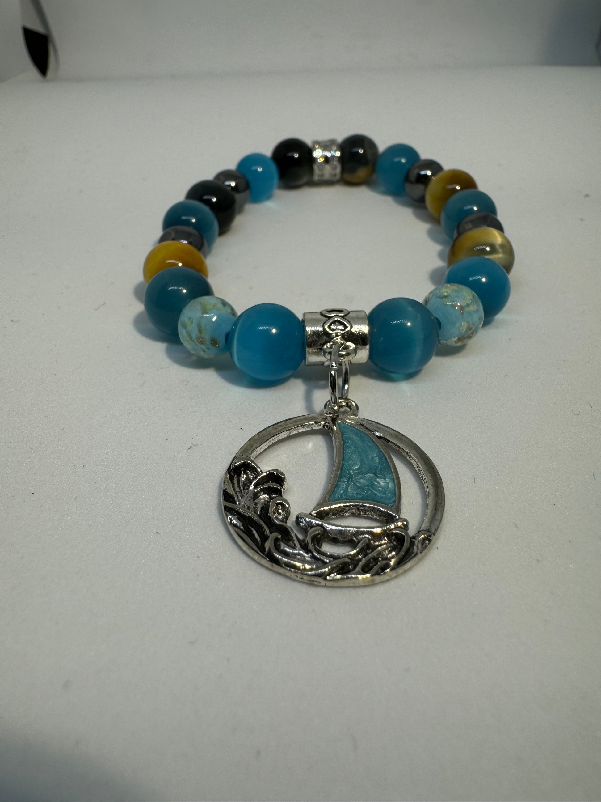 Dream tiger eye/Sky blue cat eye/hematite/glow in the dark bead bracelet with sailboat charm