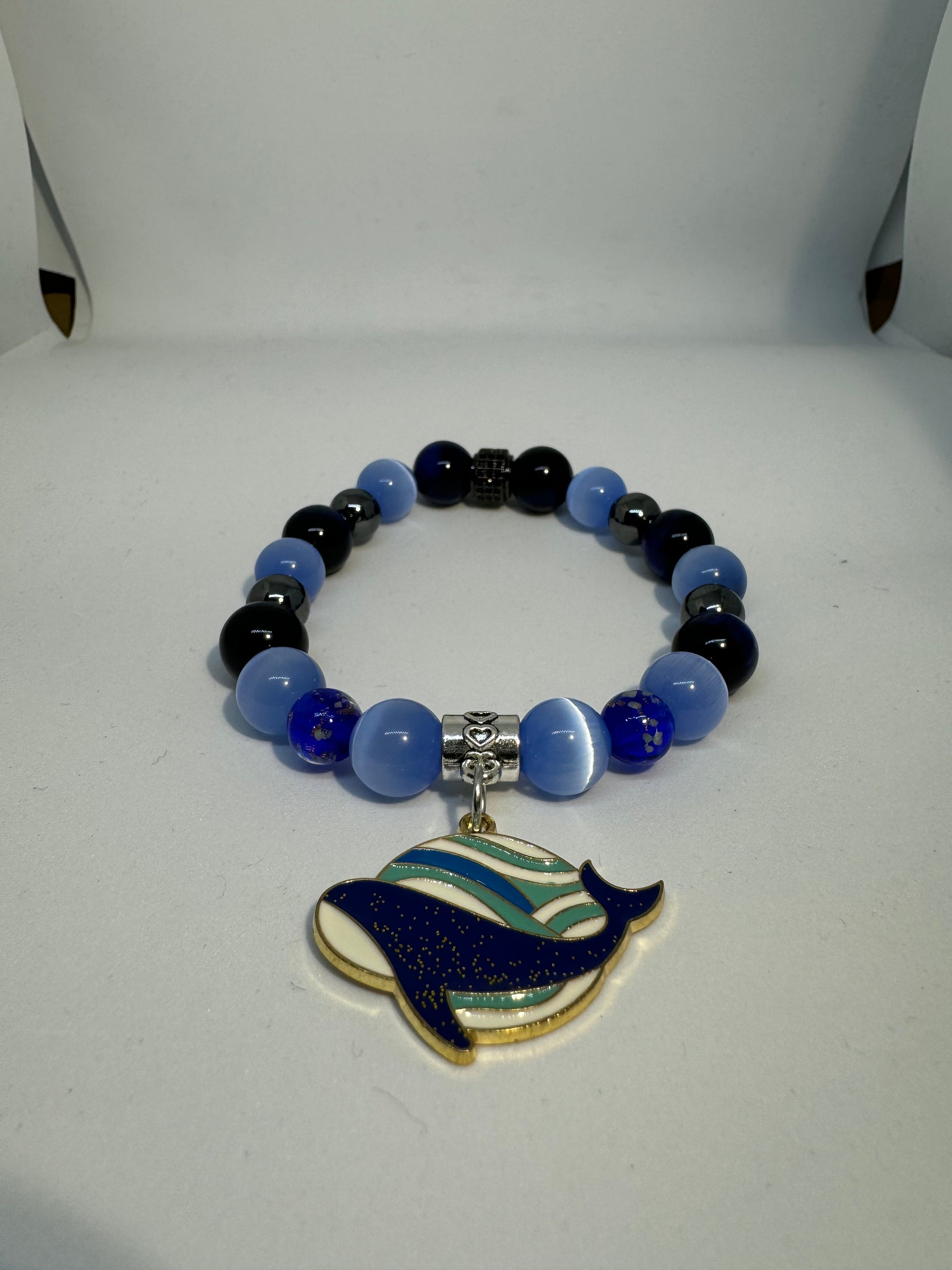 Oxford tiger eye/Powder blue cat eye/Hematite/glow in the dark bead bracelet with whale charm