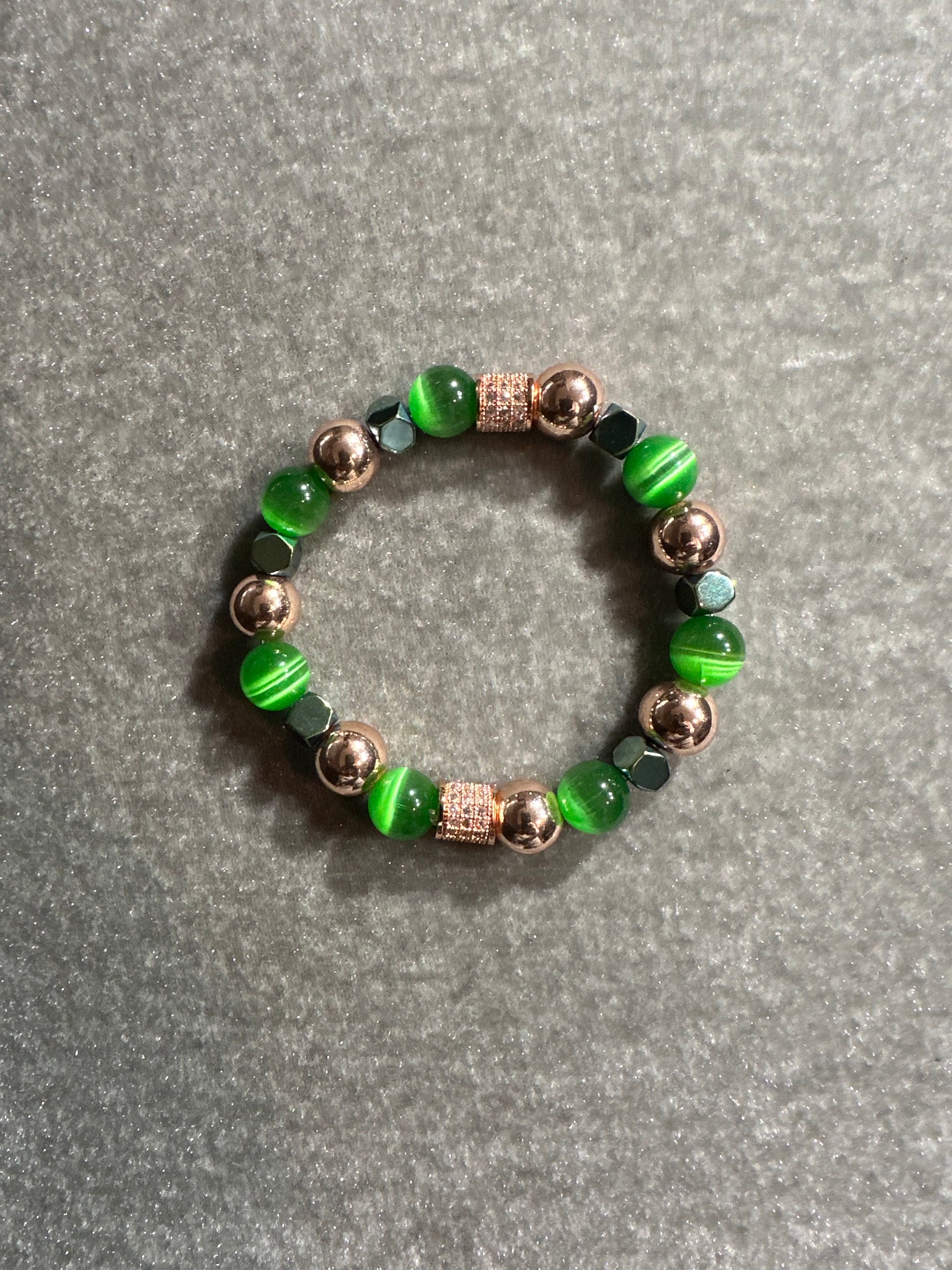Green cat eye/rose gold bead bracelet with green hematite spacers
