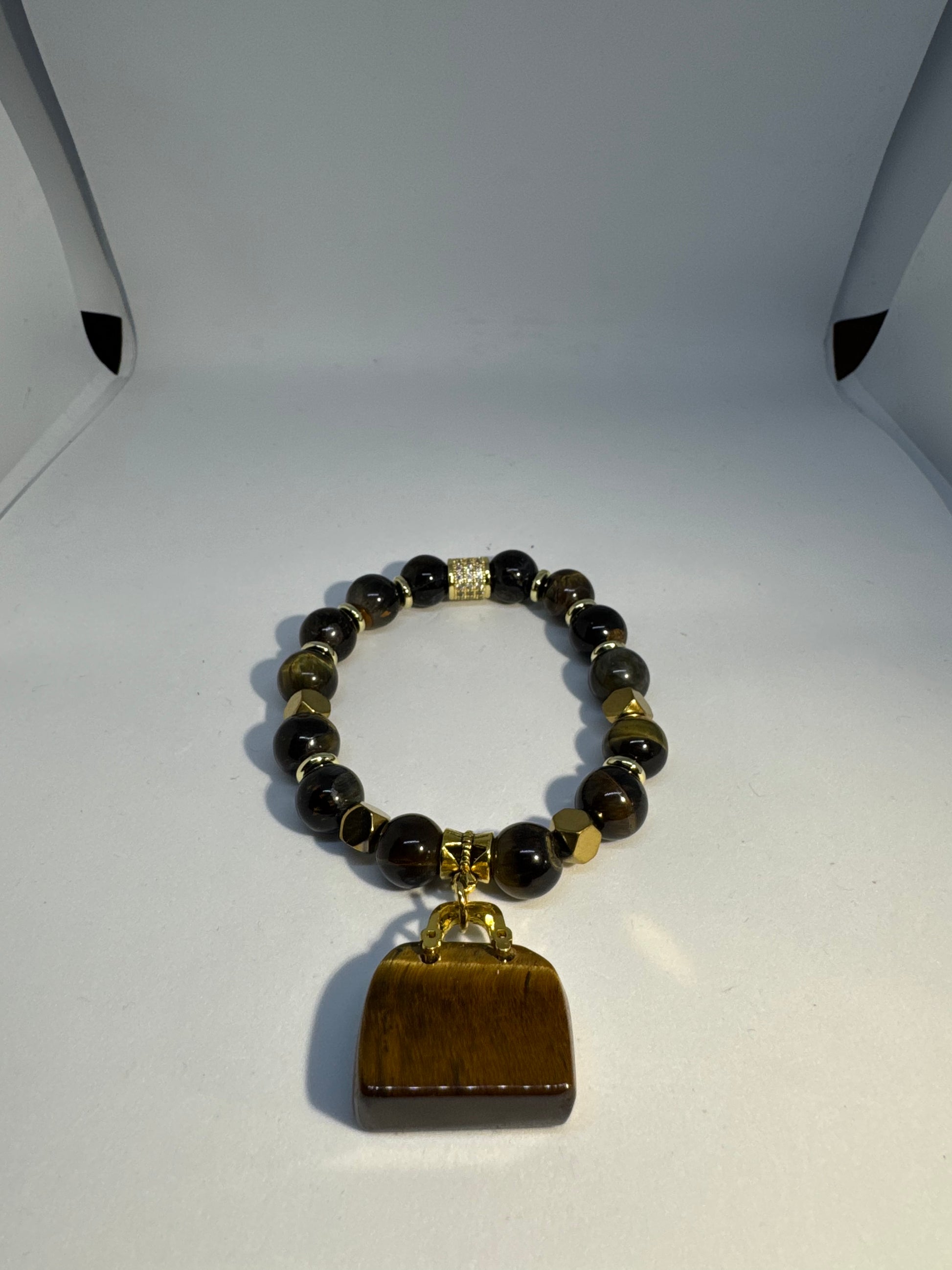 Tiger/gold hematite bead bracelet with brown bag charm