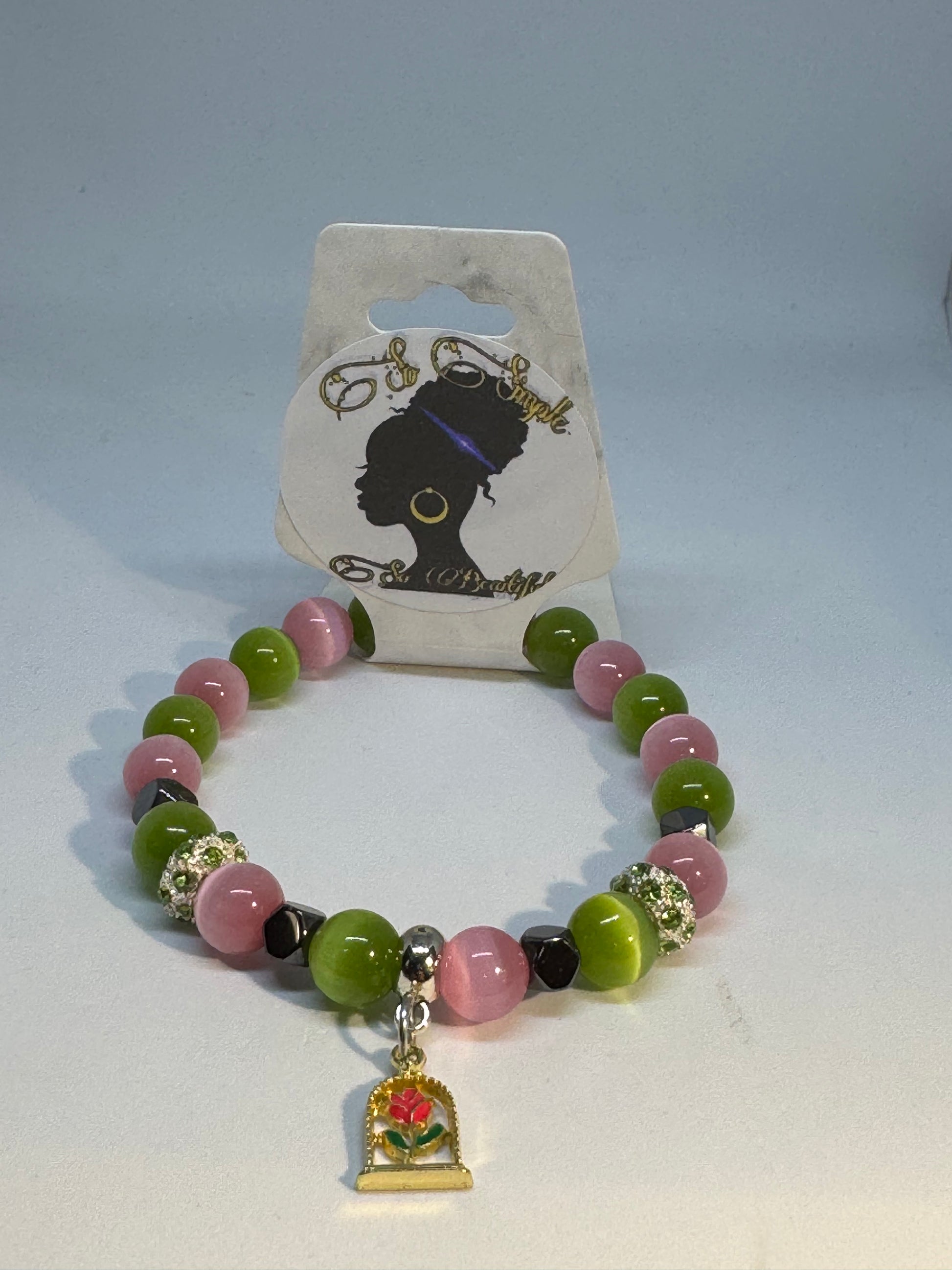 Divine 9 AKA Pink/green cat eye/hematite bead with rose charm