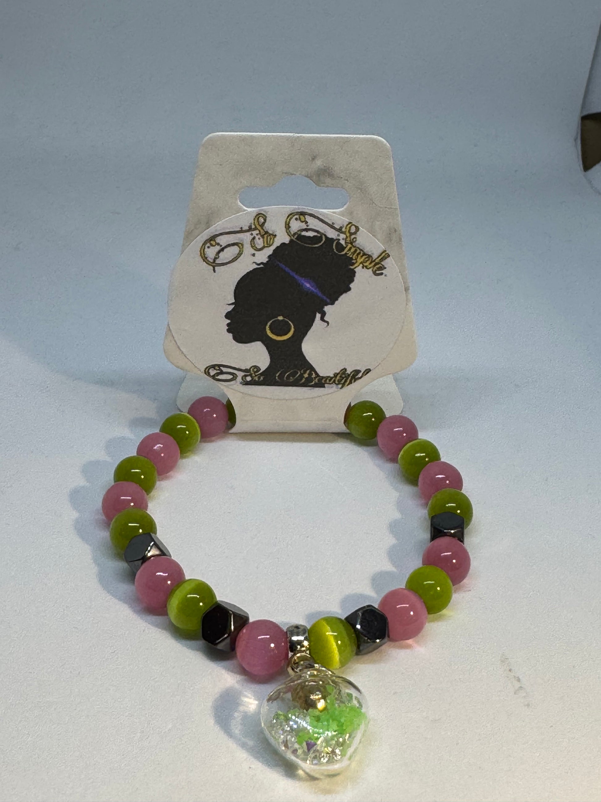 Divine 9 AKA Pink/green cat eye/hematite bead with glow in the dark heart charm