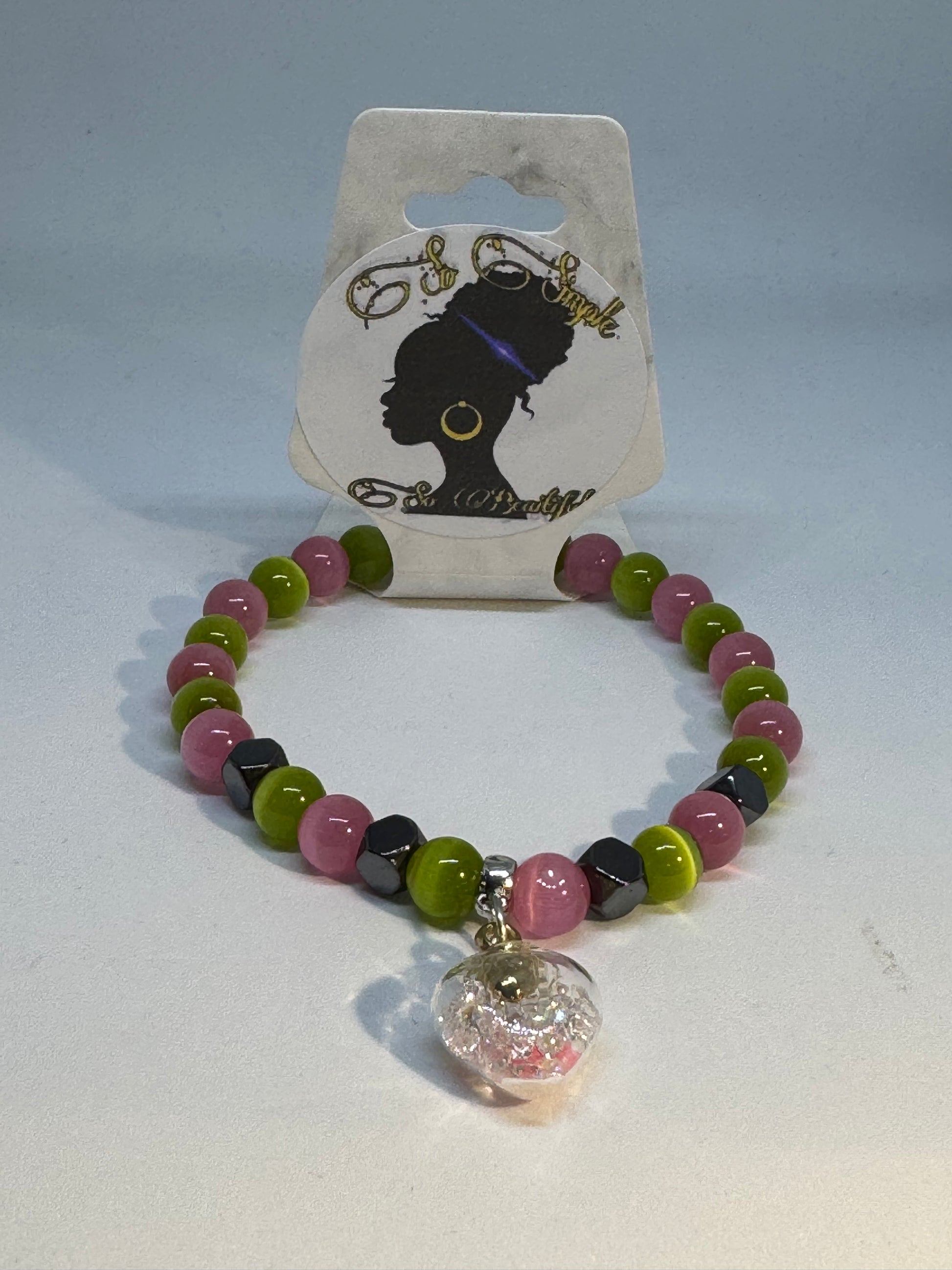 Divine 9 AKA Pink/green cat eye/hematite bead with glow in the dark heart charm