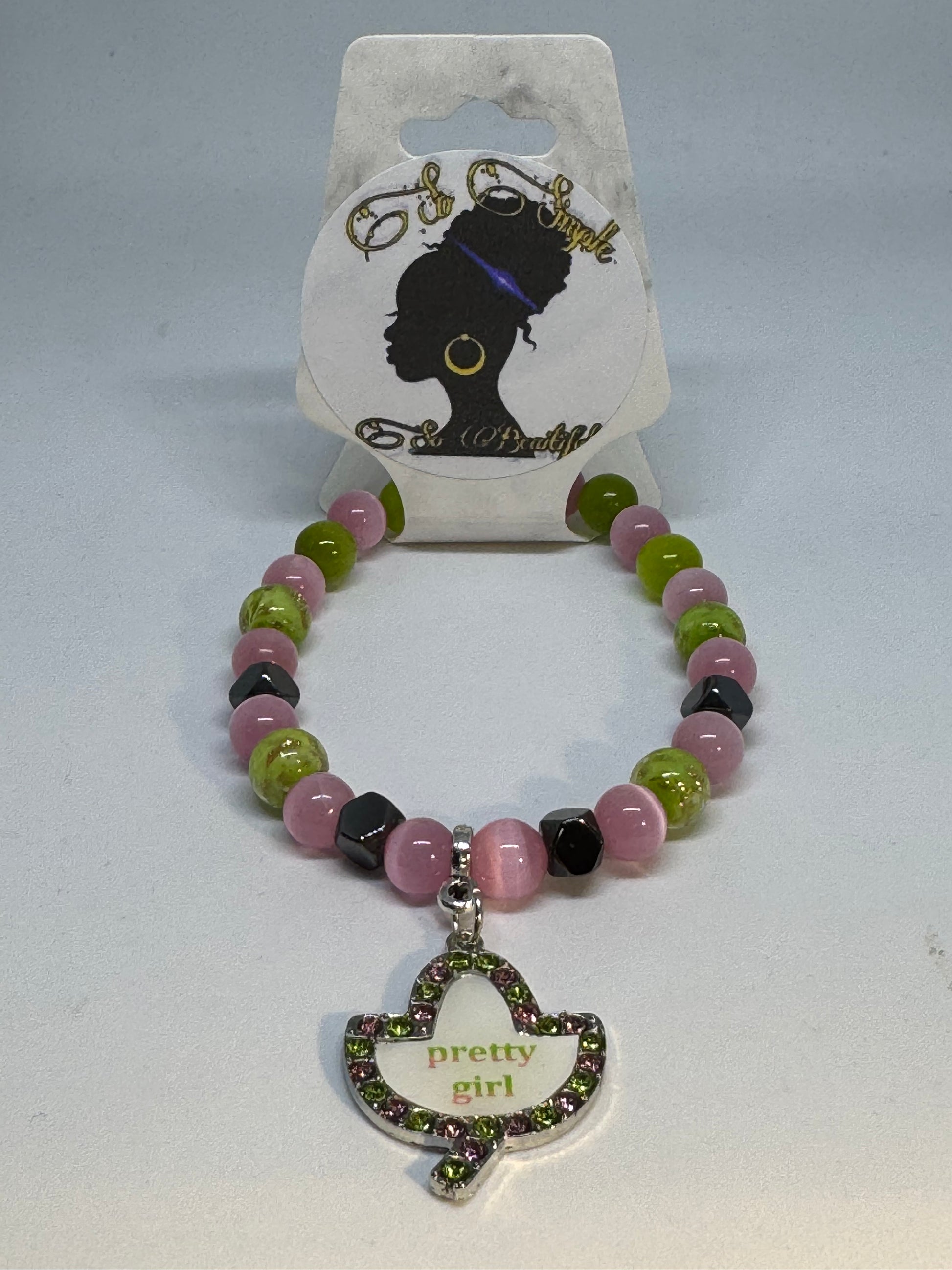 Divine 9 AKA Pink/green cat eye/hematite/glow in the dark bead bracelet with pretty girl charm
