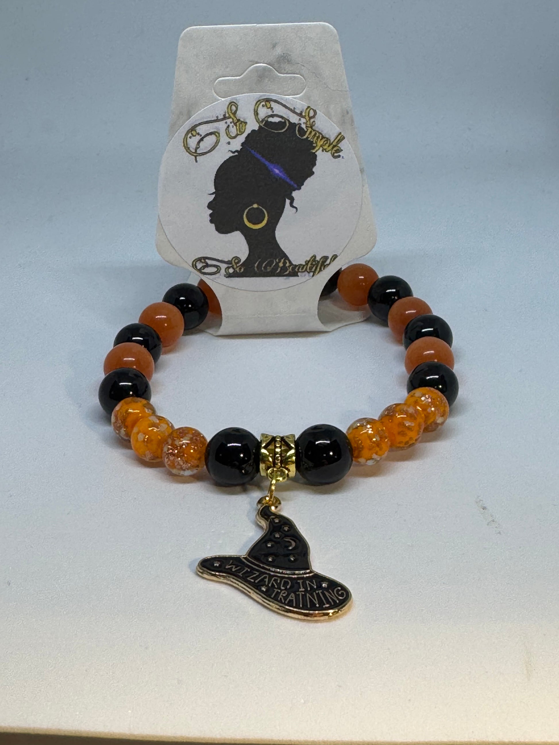 Halloween onyx/orange cat eye/glow in the dark bead bracelet with witch's hat charm