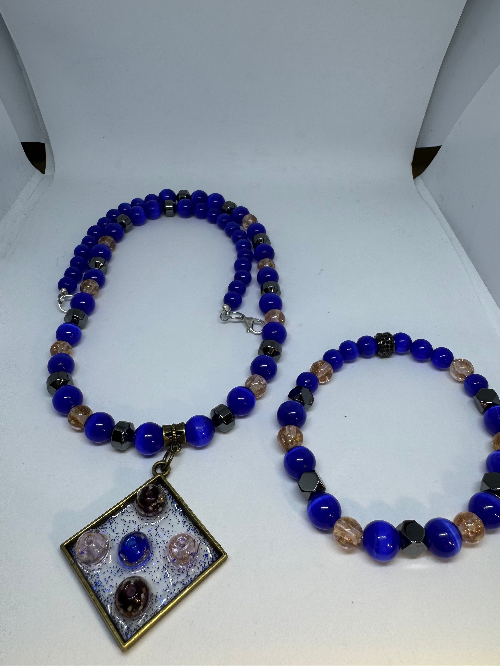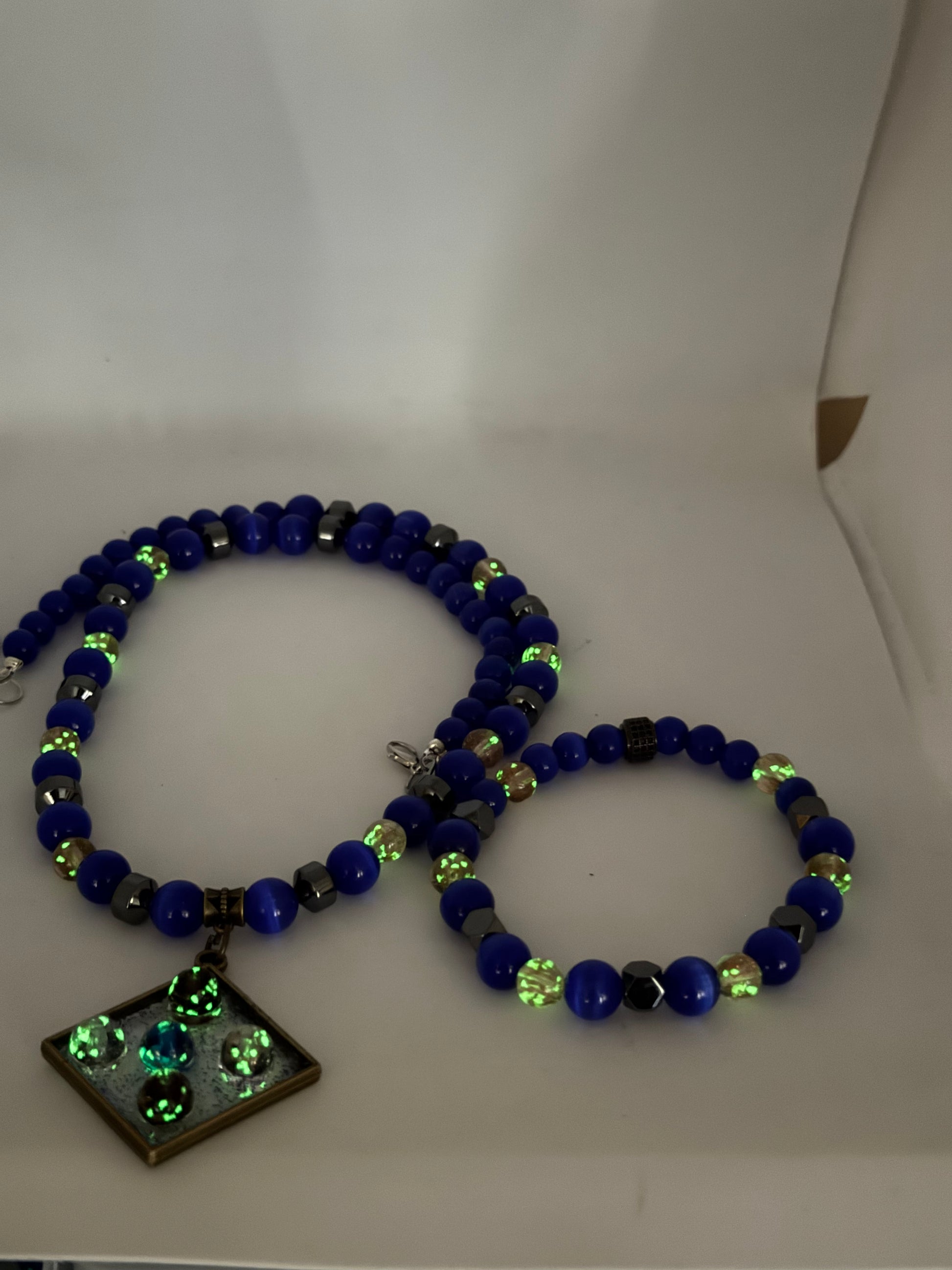 Blue cat eye/hematite/glow in the dark bead bracelet/necklace with custom resin glow in the dark charm