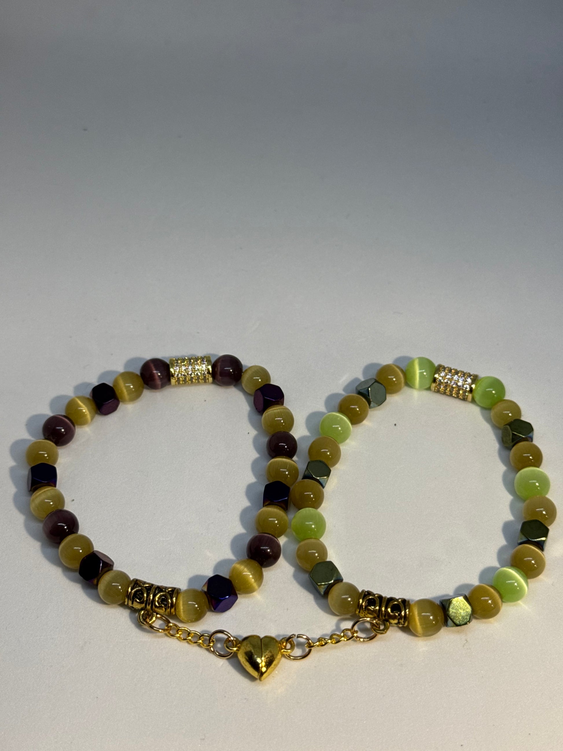 Love Connection set of 2: Bracelet 1- Purple/Gold cat eye/purple hematite spacers. Bracelet 2- Gold/light green cat eye/green hematite spacers. Both with half magnetic charm