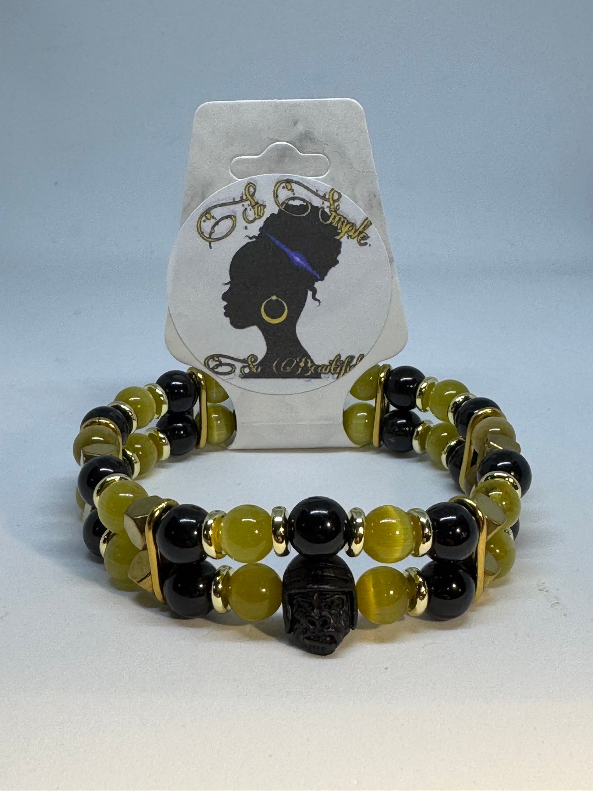 Divine 9 Alpha Onyx/gold cat eye/hematite double strand bead bracelet with ape charm
