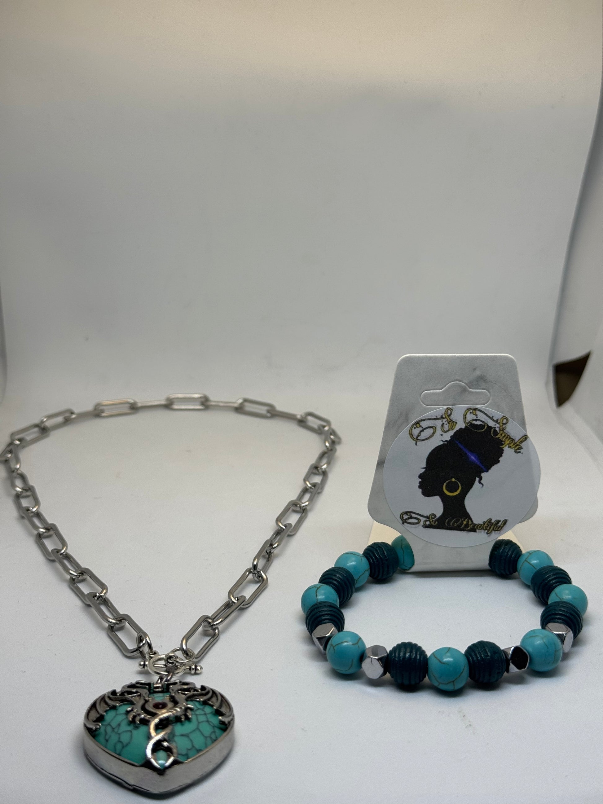 Paperclip necklace with turquoise train your dragon charm/turquoise/blue wood bead bracelet