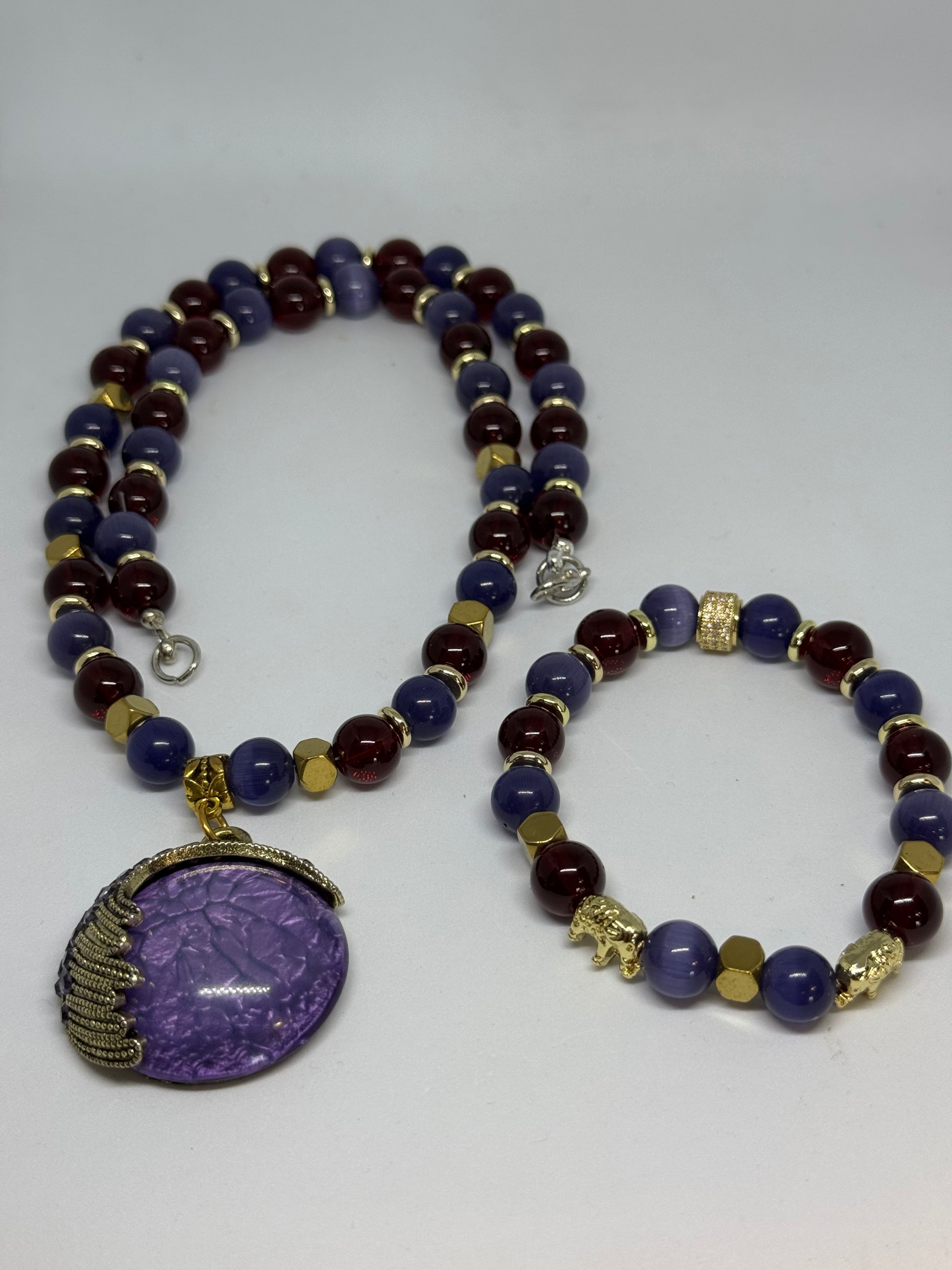 Garnet red/purple cat eye/hematite bead bracelet/necklace set with moon/elephant charms