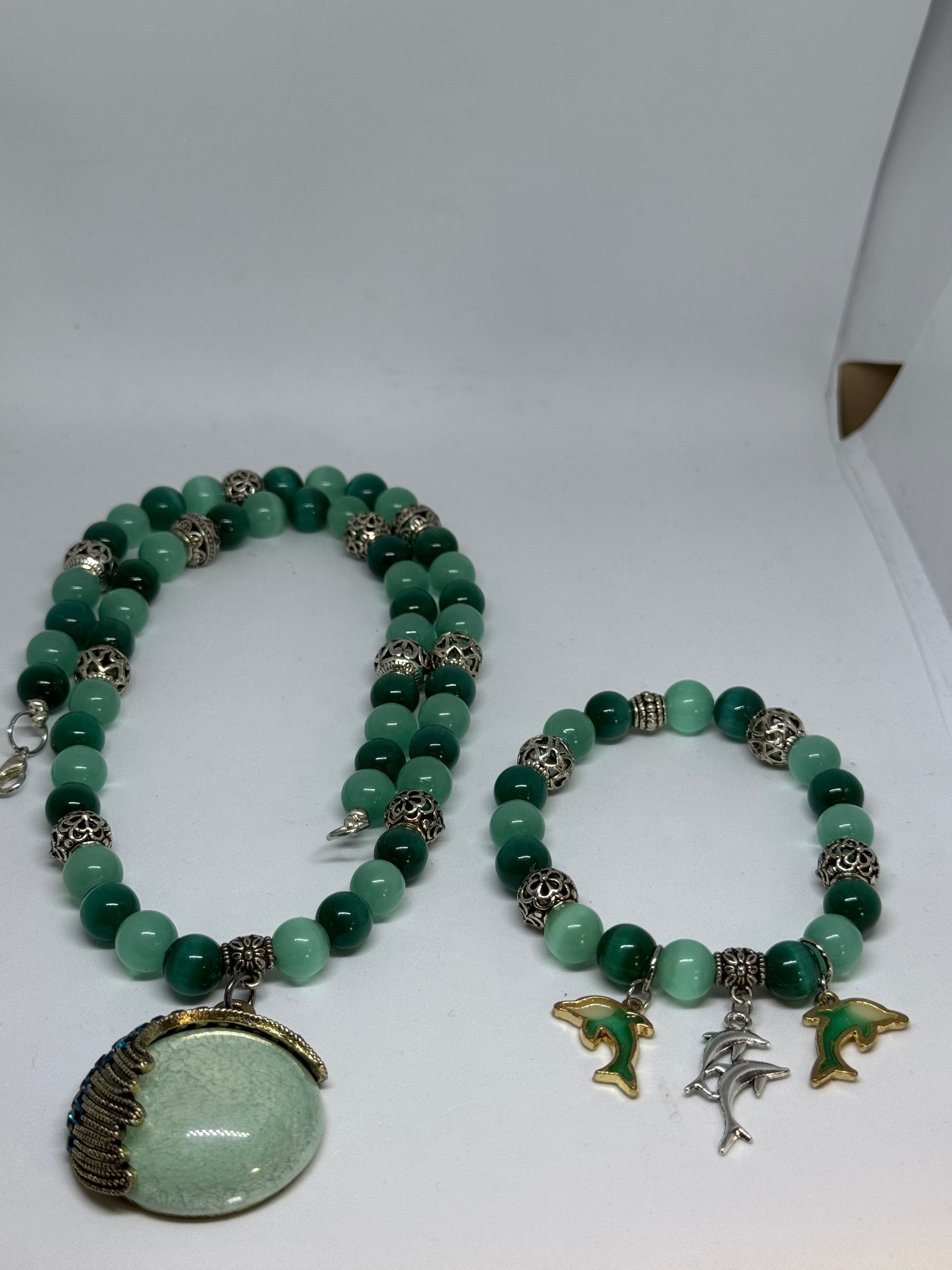 Forest green/teal cat eye bead bracelet/necklace set with moon/dolphin charms