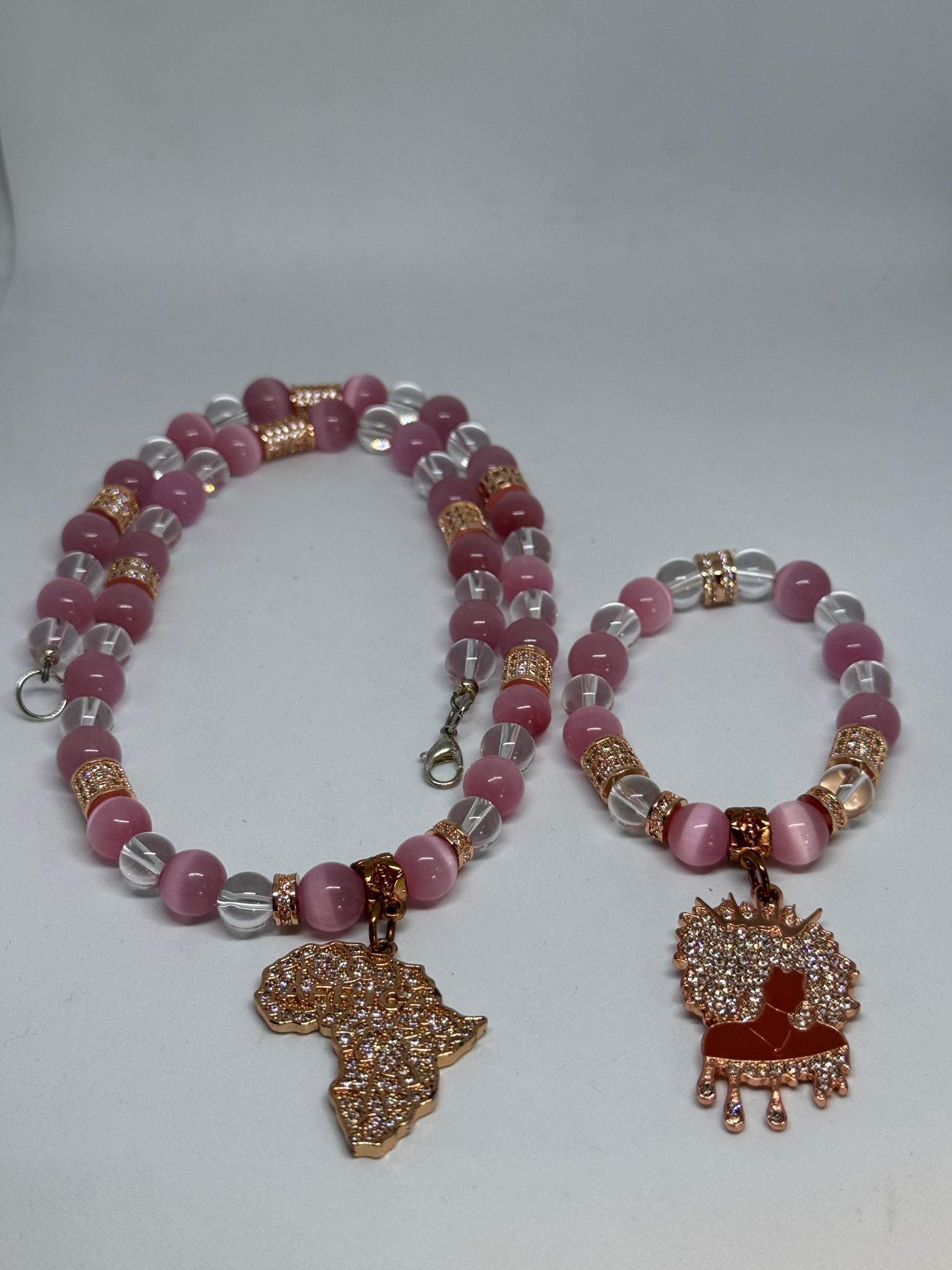 Pink cat eye/clear bead bracelet/necklace set with Africa/black girl charms