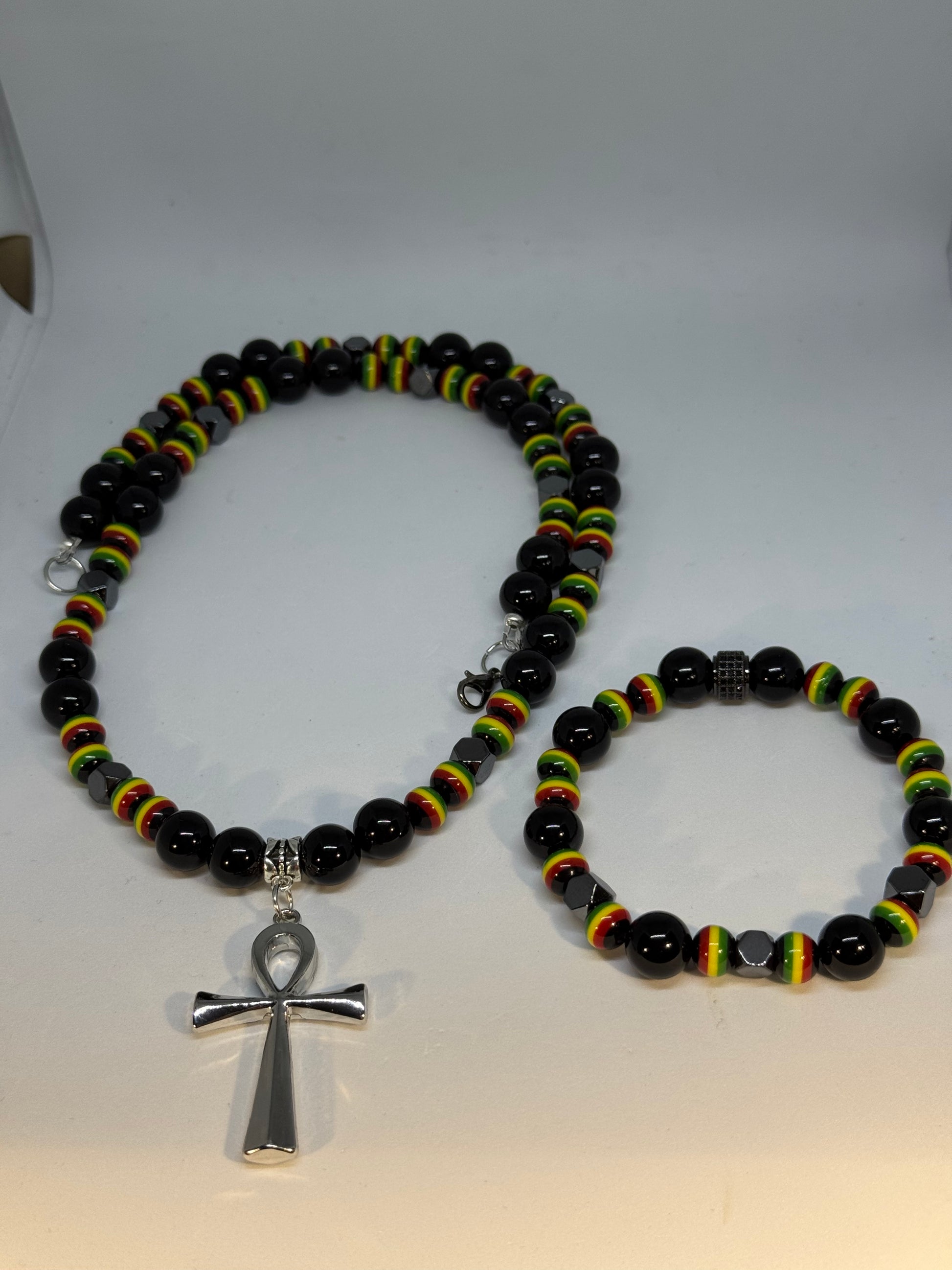 Onyx/Jamaican/hematite bead bracelet/necklace set with silver ankh