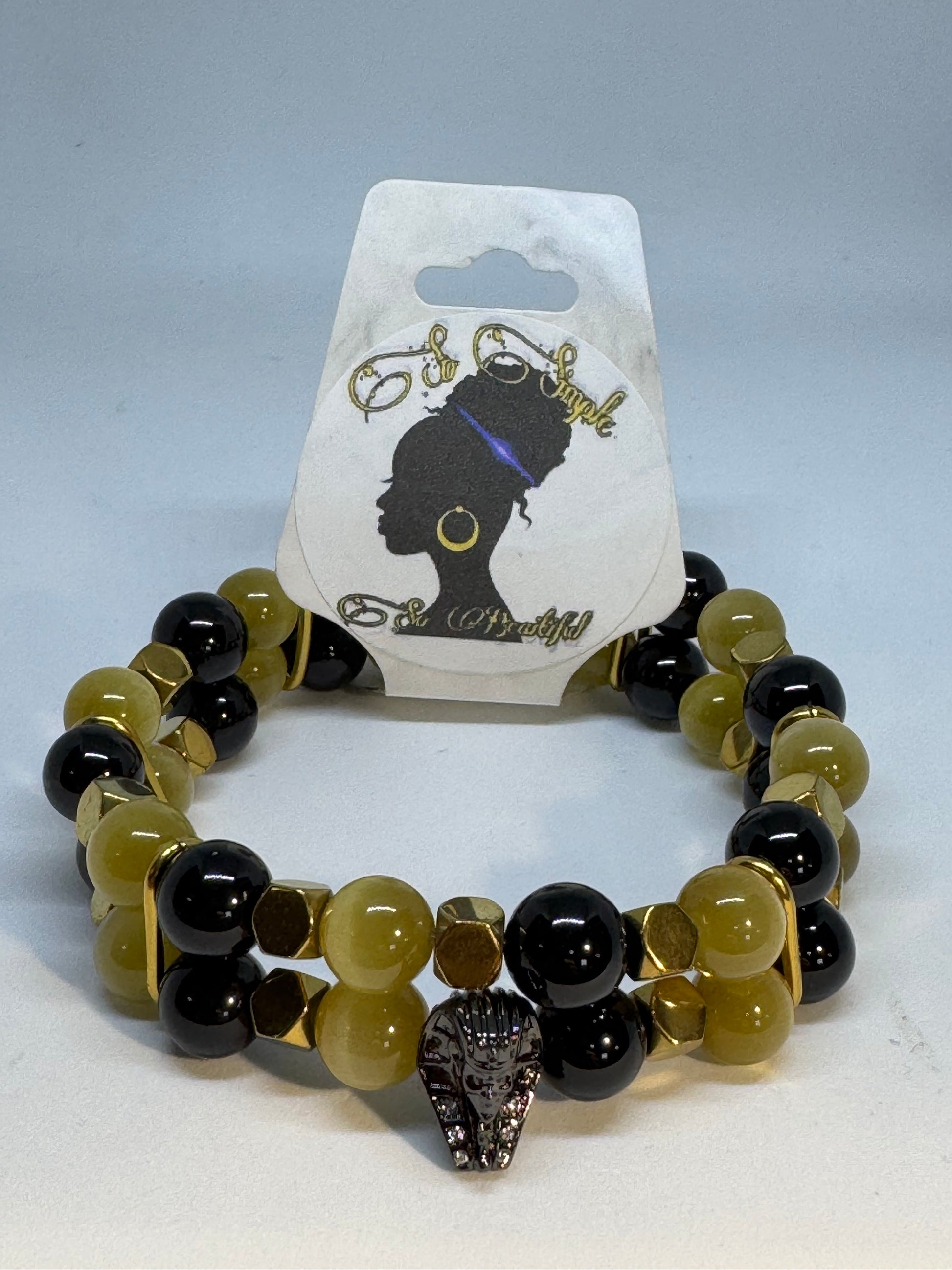 Divine 9 Alpha Onyx/gold cat eye/hematite double strand bead bracelet with Sphinx charm