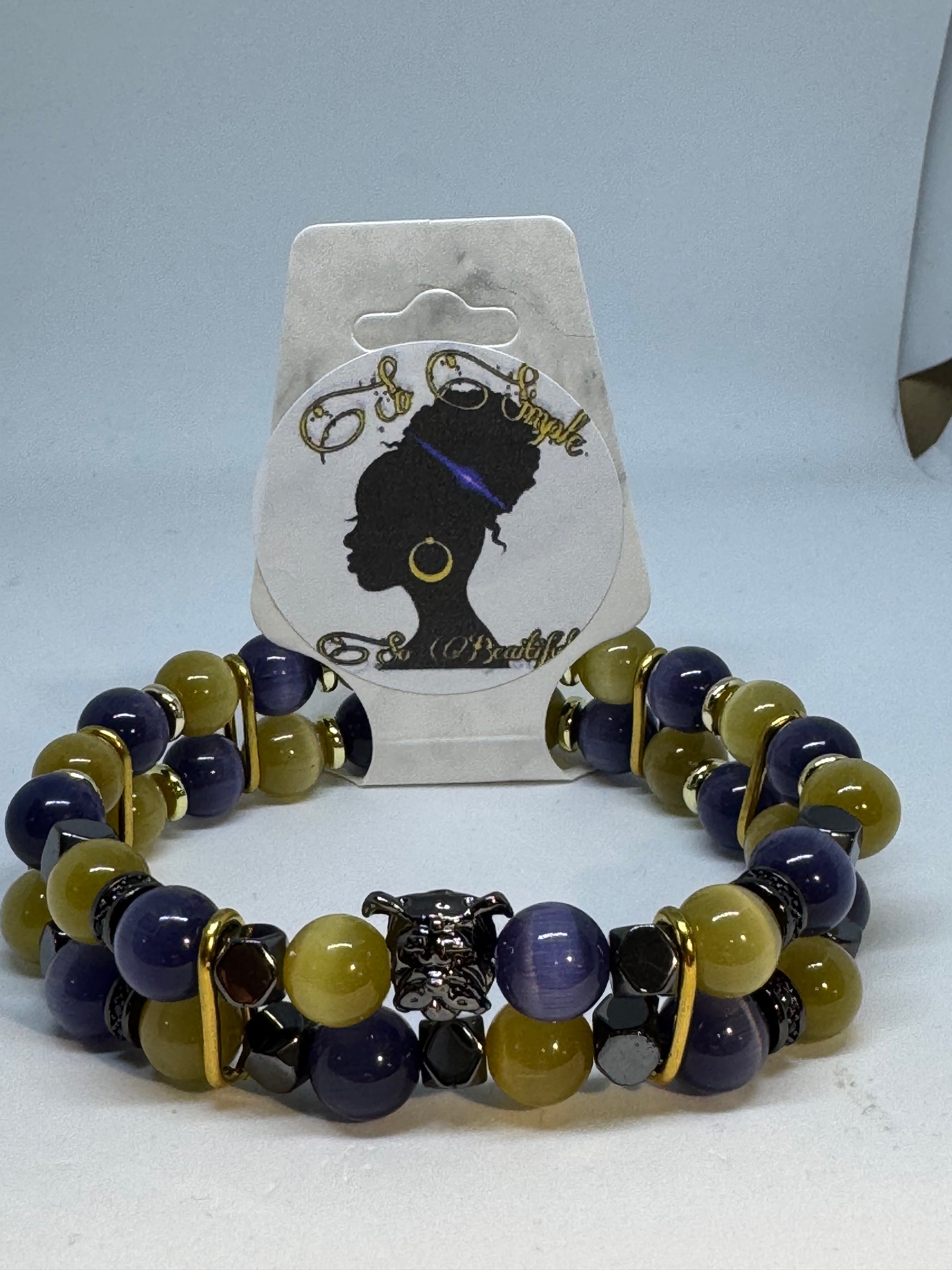 Divine 9 Omega Purple/gold cat eye/hematite double strand bead bracelet with bulldog charm
