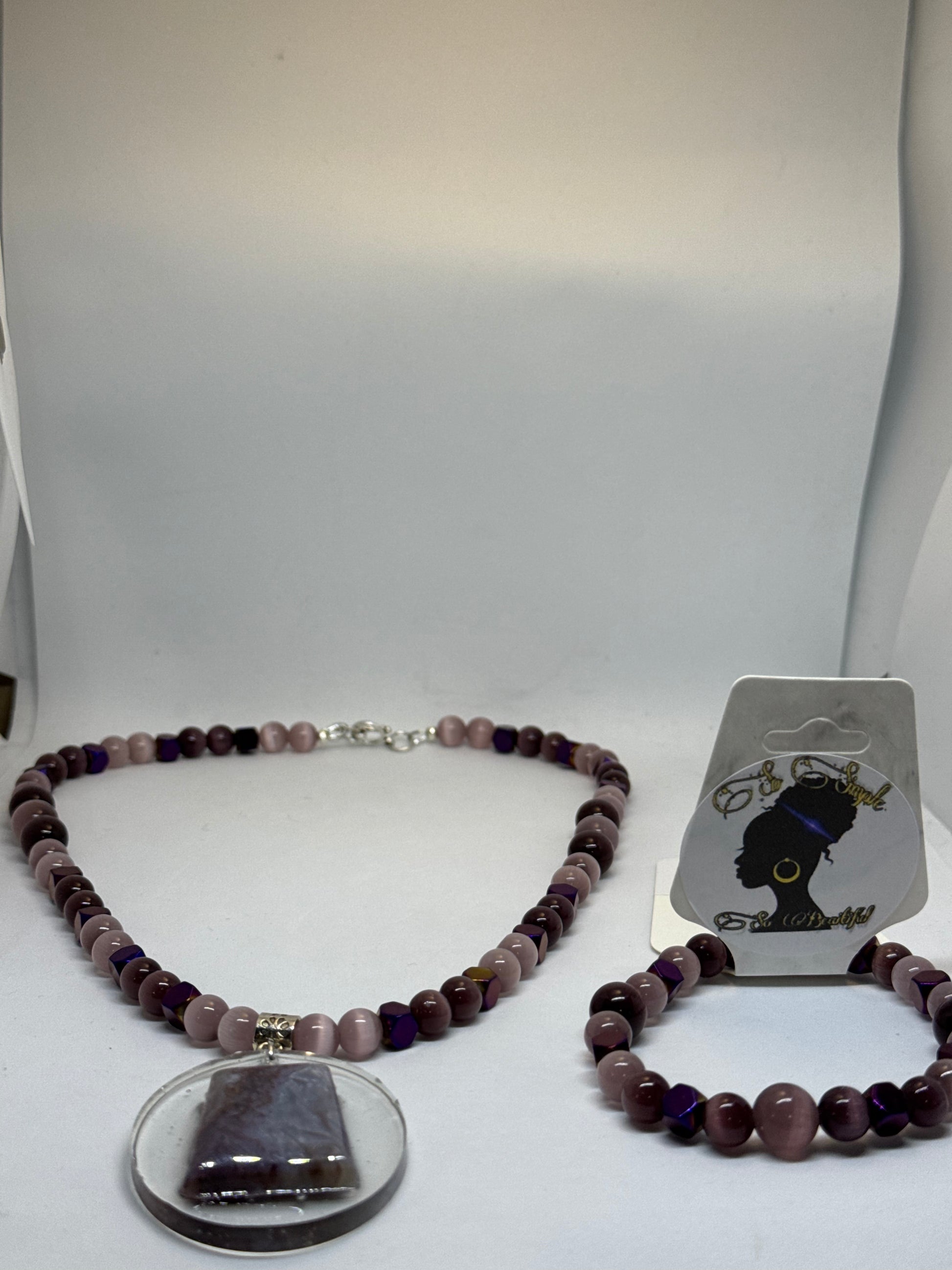 Pink/purple cat eye/hematite bead necklace with resin poured amethyst stone/pink/purple hematite bead bracelet