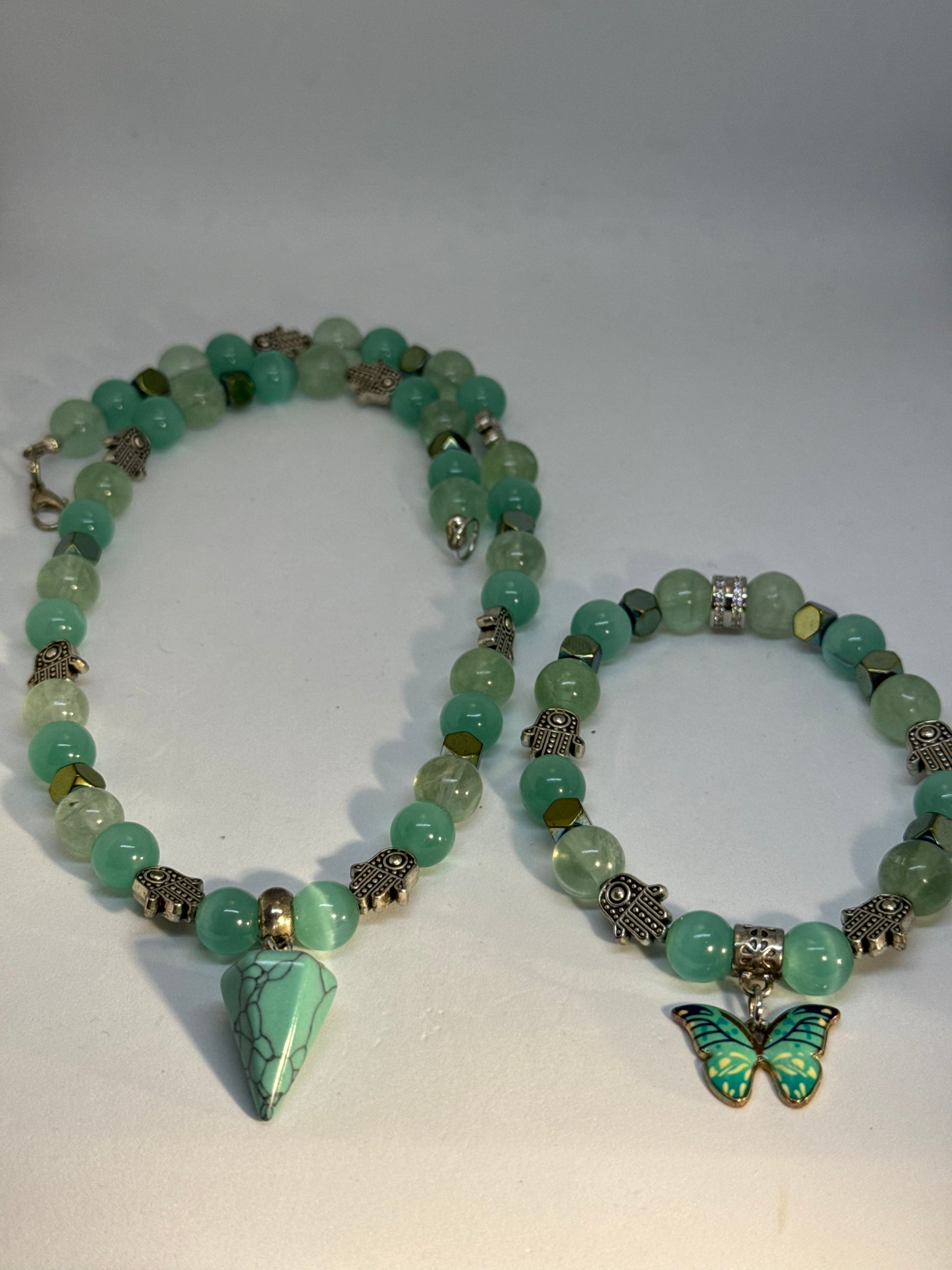 Fluorite/teal cat eye/hematite bead bracelet/necklace set with cone stone pendant and butterfly charm