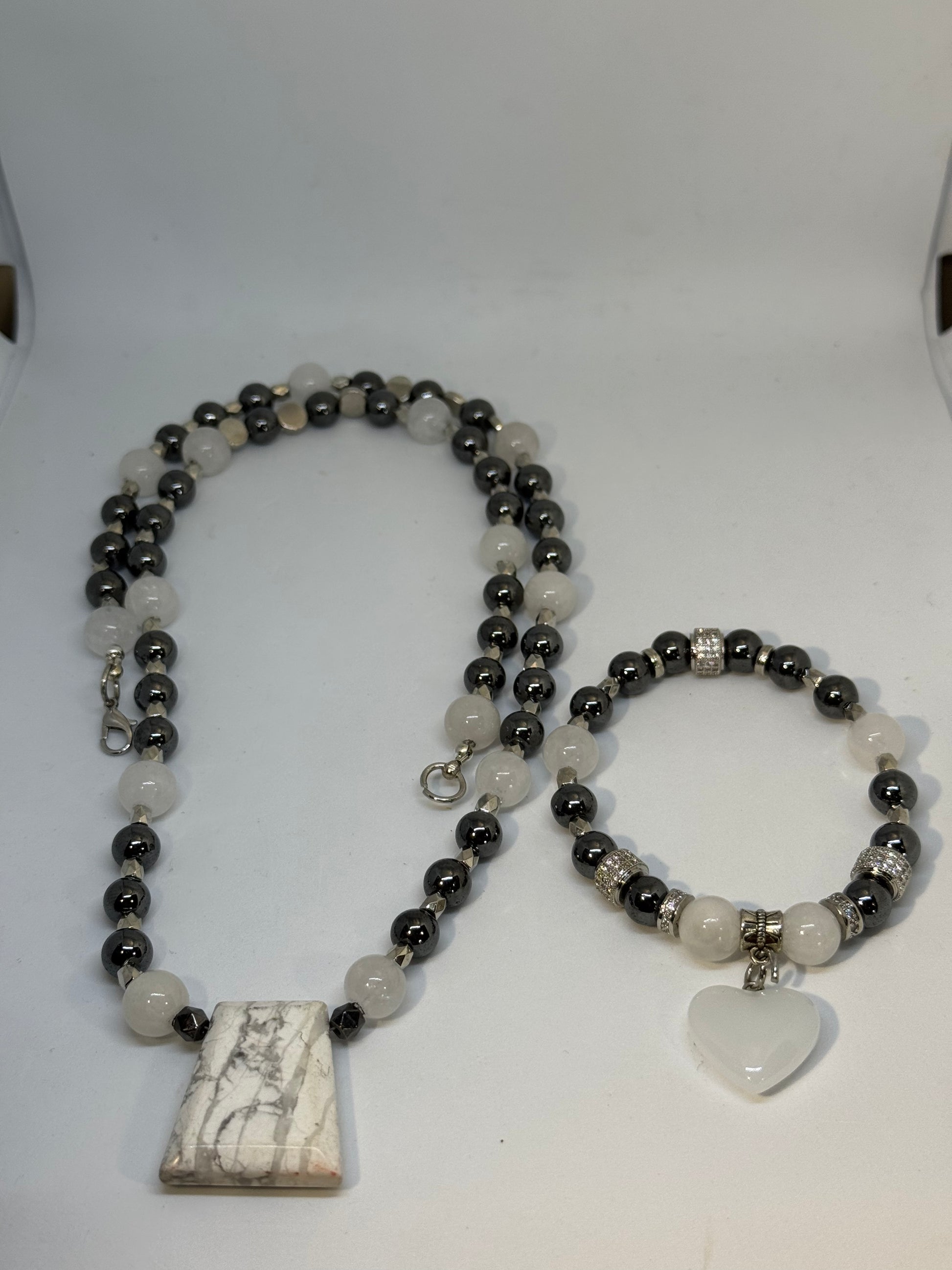 White jade/hematite bead bracelet/necklace set with stone charm/heart charms
