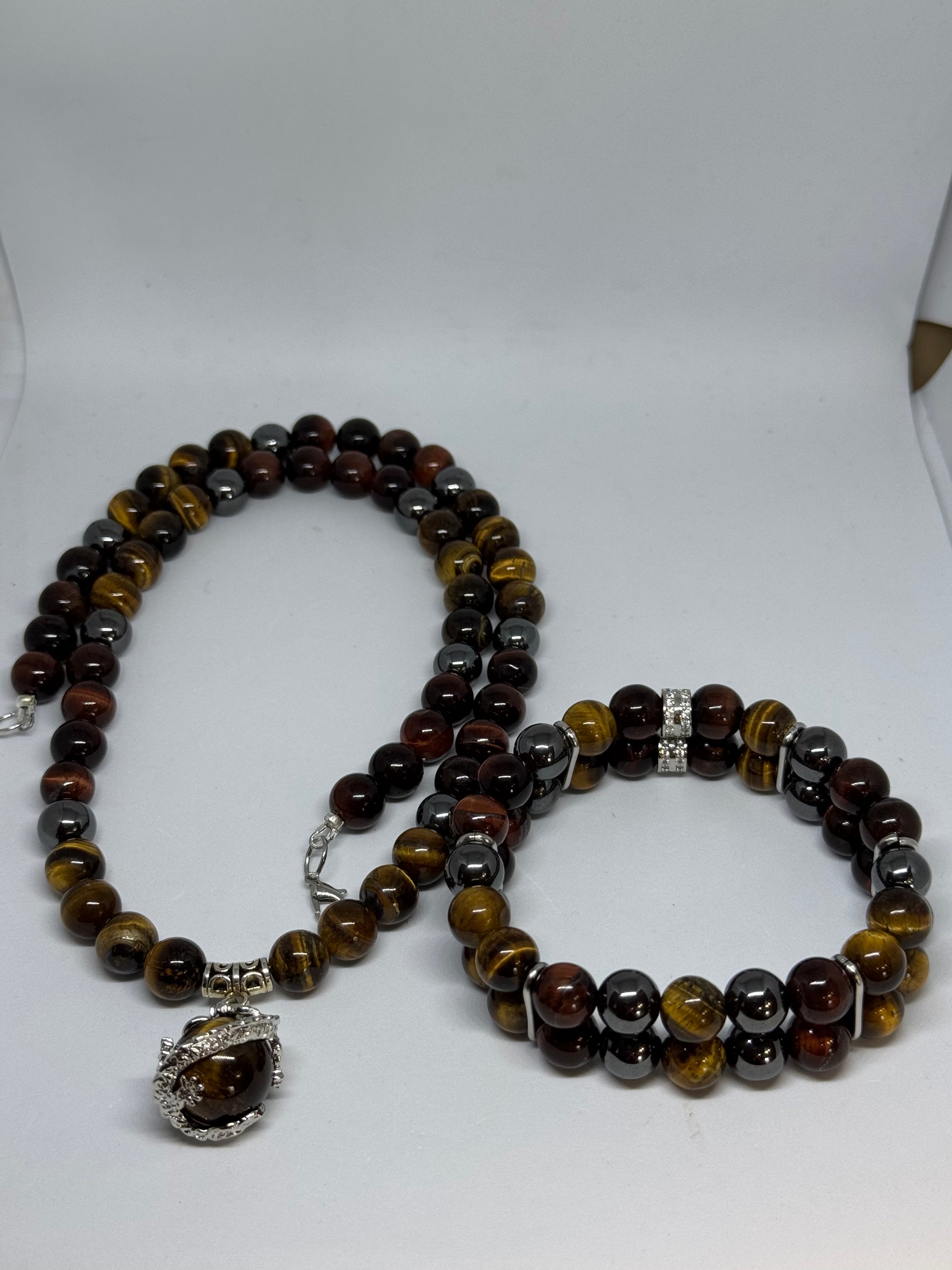 Tiger eye/red tiger eye/hematite double strand bead bracelet/necklace set with dragon charm
